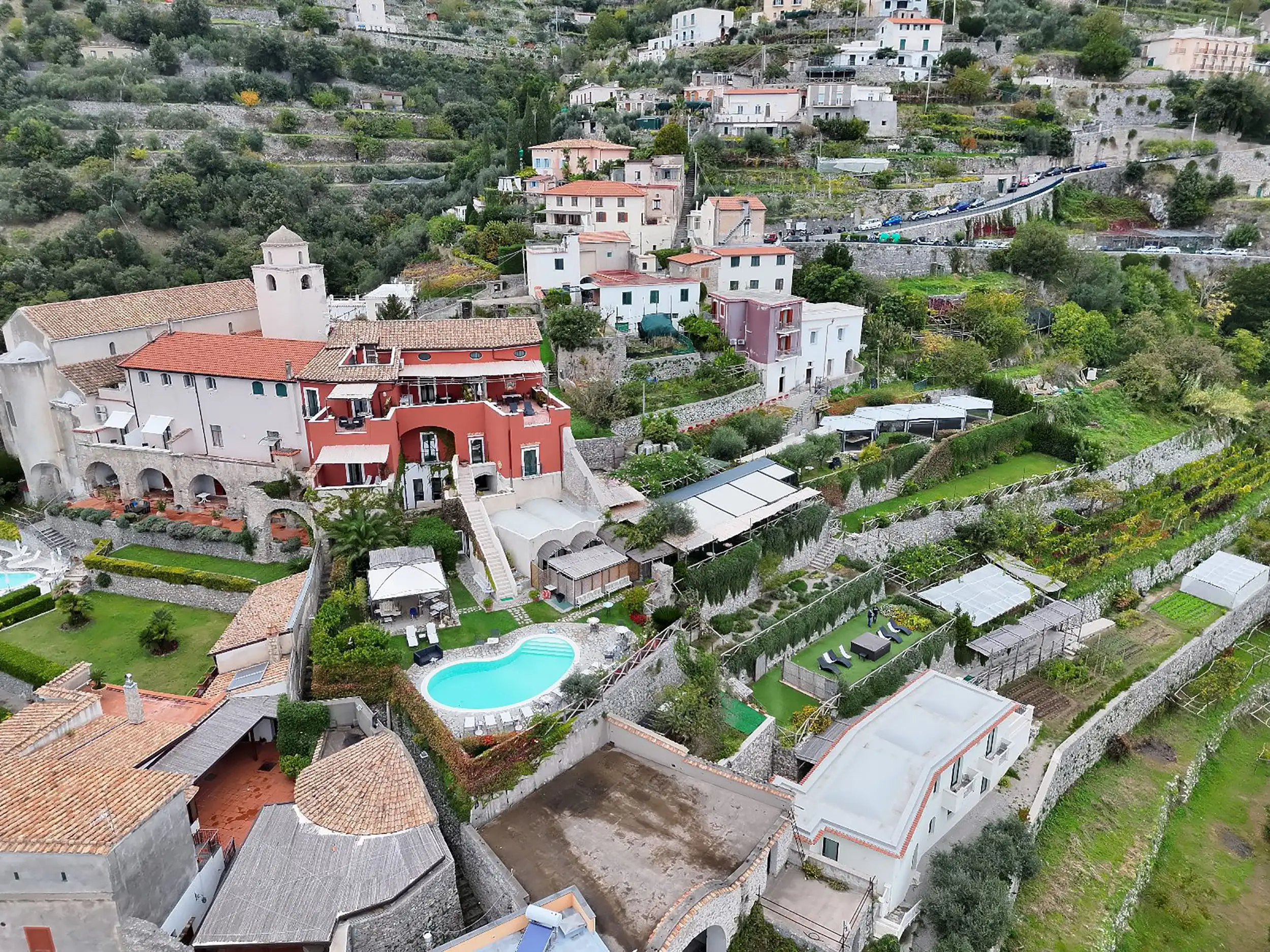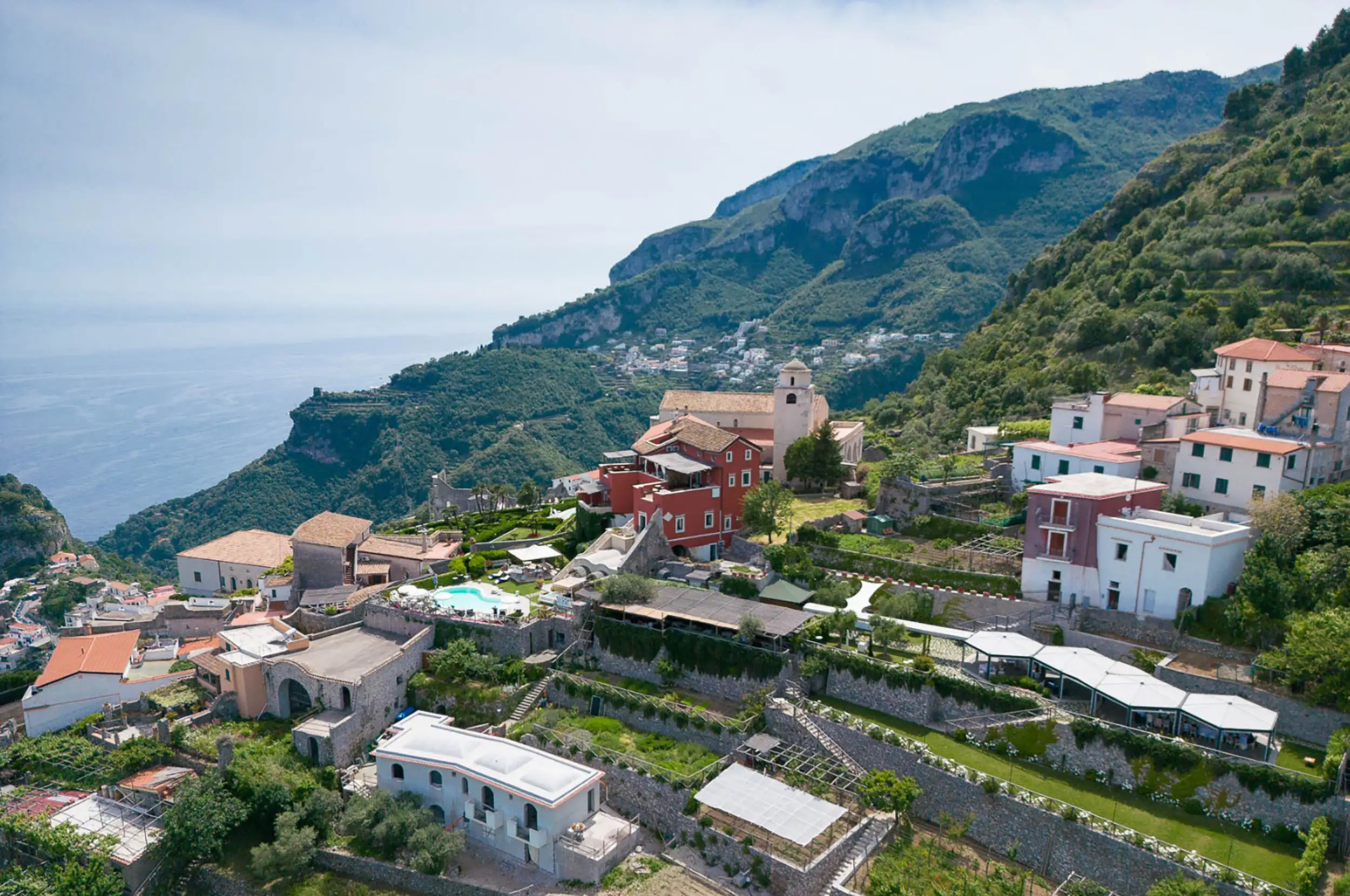 Una dimora nobiliare tra Amalfi e Ravello, circondata dalla natura mediterranea, con terrazze panoramiche, giardini affacciati sul mare e una vista iconica su Amalfi, Atrani e Ravello.
